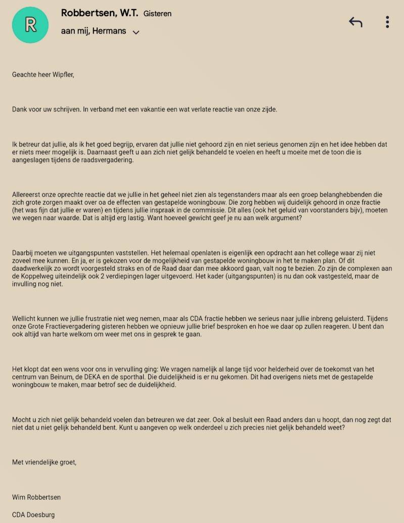 Antwoord van Wim Robbertsen op onze brief van 6 oktober 2023