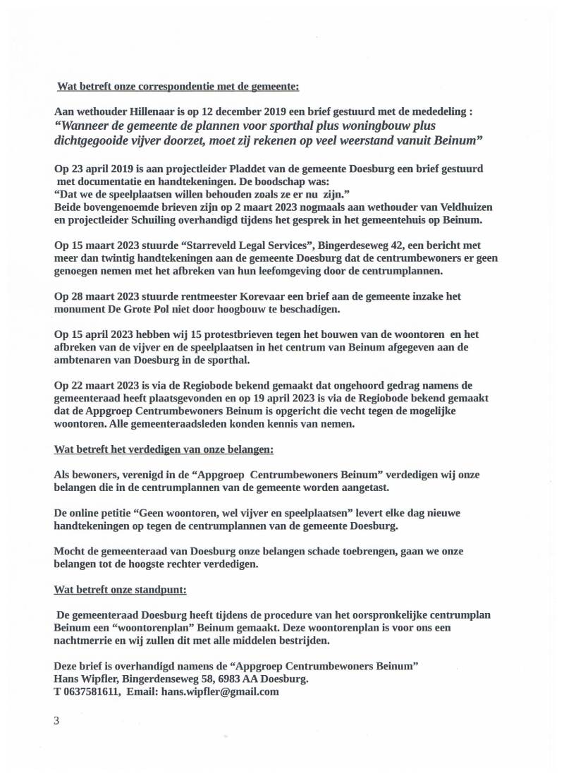 Onderstaande Brief aan de gemeenteraad Doesburg overhandigd!