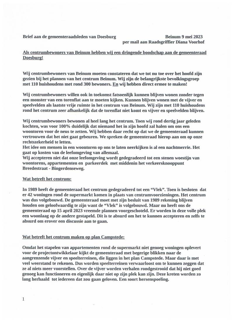 Aantekeningen op brief van Robbertsen van 21-8-2023 en oproep tot herziening van de plannen voor het cetrum Beinum.